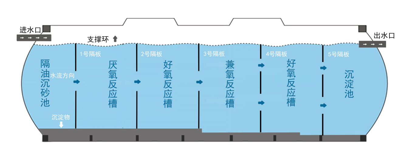 分户式净化槽采用多级A/O工艺,能够有效去除生活污水中的杂物,实现单户/多户的生活污水就地处理,主要针对分散式区域的污水处理设计。采用高度集成化的一体化分散式的多级AO污水处理技术将厌氧反应槽、好氧反应槽、兼氧反应槽、好氧反应槽、沉淀槽等各项功能区集于一体化设备内,应用于区域较分散的生活污水处理。